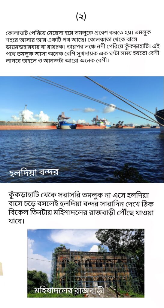 কুঁকড়াহাটি থেকে সরাসরি তমলুক না এসে হলদিয়া বাসে চড়ে বসলেই হলদিয়া বন্দর সারাদিন দেখে ঠিক বিকেল তিনটায় মহিশাদলের রাজবাড়ী পৌঁছে যাওয়া যাবে। মহিশাদলের রাজবাড়ী এক ঐতিহাসিক দলিল। এক দু ঘন্টা ঘুরে দেখে নিয়ে সোজা বাসে তমলুক। তমলুকে অনেক হোটেল লজ আছে ওখানেই রাত্রিবাস। পরদিন সকাল সকাল স্নান সেরে বর্গভীমা মন্দিরে পৌঁছে যেতে হবে।
