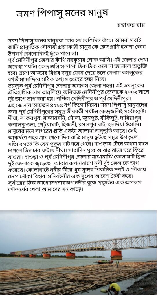 মানুষের মনে সাগরের প্রতি একটা আলাদা অনুভূতি আছে। সেই আকর্ষণে শহর গ্রাম থেকে দিবারাত্রি মানুষ ছুটছে সমুদ্র উপকূলে। সত্যি বলতে কি যেন পুকুর ঘাট হয়ে গেছে। হাওড়ায় ট্রেনে অথবা বাসে চাপলে তিন চার ঘণ্টায় দীঘা। সারাদিন ঘুরে আবার রাত্রে ঘরে ফিরে যাওয়া। হাওড়া ও পূর্ব মেদিনীপুর জেলার মাঝামাঝি কোলাঘাট ব্রিজ দুই জেলাকে জুড়েছে। আবার রূপনারায়ণ নদী দুই জেলাকে ভাগ করেছে। কোলাঘাটে নদীর তীরে খুব সুন্দর পিকনিক স্পট ও নৌকায় চেপে নৌকা বিহার অনির্বচনীয় এক সুখের আবেশ তৈরী করে। সূর্যাস্তের ঠিক আগে রূপনারায়ণ নদীর বুকে প্রকৃতির এক অপরূপ সৌন্দর্যের খেলা আমাদের মন কাড়ে।