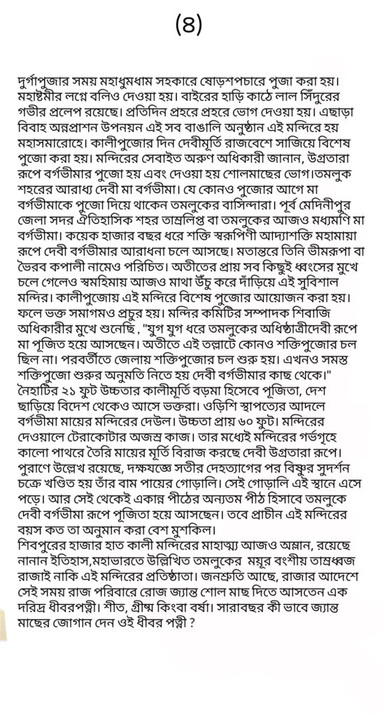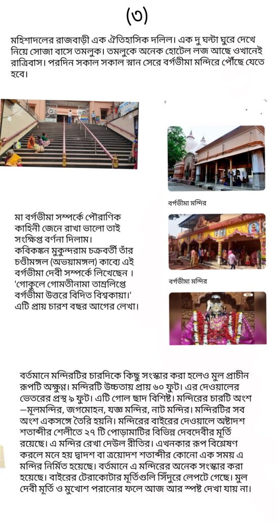 পূর্ব মেদিনীপুর জেলার কাঁথি মহকুমার লোক আমি। এই জেলার দেখা অদেখা পর্যটন কেন্দ্রগুলি সম্পর্কে ঠিক ঠিক করে না জানালে অতুক্তি হবে। ভ্রমণ আড্ডার বিপ্লব বসুর ফোন পেয়ে চলে গেলাম তমলুকের বর্গভীমা মন্দিরে সঠিক তথ্য সংগ্রহের ইচ্ছা নিয়ে।