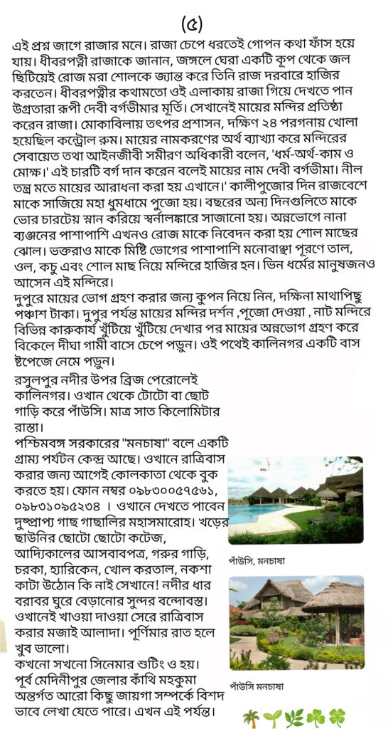 পশ্চিমবঙ্গ সরকারের “মনচাষা” বলে একটি গ্রাম্য পর্যটন কেন্দ্র আছে। ওখানে রাত্রিবাস করার জন্য আগেই কোলকাতা থেকে বুক করতে হয়। ফোন নম্বর ০৯৮৩০০৫৭৫৬১, ০৯৮৩১০৯৫২৩৪ । ওখানে দেখতে পাবেন দুষ্প্রাপ্য গাছ গাছালির মহাসমারোহ। খড়ের ছাউনির ছোটো ছোটো কটেজ, আদ্যিকালের আসবাবপত্র, গরুর গাড়ি, চরকা, হ্যারিকেন, খোল করতাল, নকশা কাটা উঠোন কি নাই সেখানে! নদীর ধার বরাবর ঘুরে বেড়ানোর সুন্দর বন্দোবস্ত। ওখানেই খাওয়া দাওয়া সেরে রাত্রিবাস করার মজাই আলাদা। পূর্ণিমার রাত হলে খুব ভালো।