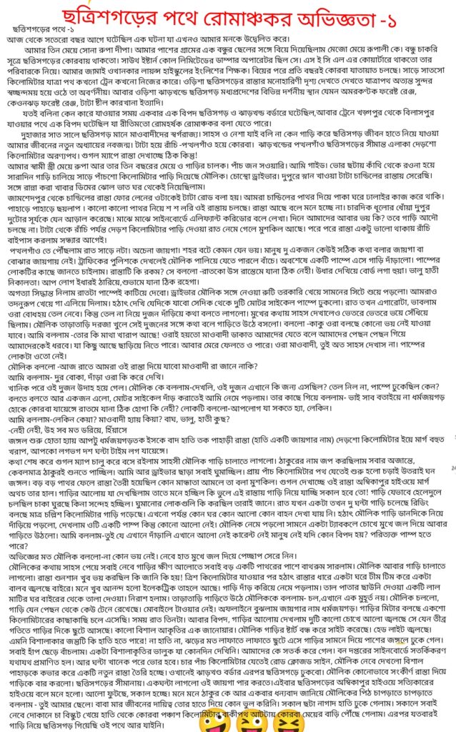 আজ থেকে সতেরো বছর আগে ঘটেছিল এক ঘটনা যা এখনও আমার মনকে উদ্বেলিত করে। আমার তিন মেয়ে সোনা রুপা দীপা। আমার পাশের গ্রামের এক বন্ধুর ছেলের সঙ্গে বিয়ে দিয়েছিলাম মেজো মেয়ে রূপালী কে। বন্ধু চাকরি সূত্রে ছত্তিসগড়ের কোরবায় থাকতো। সাউথ ইষ্টার্ন কোল লিমিটেডের ডাম্পার অপারেটর ছিল সে। এস ই সি এল এর কোয়ার্টারে থাকতো তার পরিবারকে নিয়ে। আমার জামাই ওখানকার লায়ন্স হাইস্কুলের ইংলিশের শিক্ষক। বিয়ের পরে প্রতি বছরই কোরবা যাতায়াত চলছে। সাড়ে সাতসো কিলোমিটার যাত্রা পথ কখনো ট্রেন কখনো নিজের কারে। ওড়িশা ছত্তিসগড়ের রাস্তার মনোহারিণী দৃশ্য দেখতে দেখতে যাত্রাপথ অত্যন্ত সুন্দর স্বচ্ছন্দময় হয়ে ওঠে তা অবর্ণনীয়। আবার ওড়িশা ঝাড়খন্ডে ছত্তিসগড় মধ্যপ্রদেশের বিভিন্ন দর্শনীয় স্থান যেমন অমরকণ্টক ফরেষ্ট রেঞ্জ, কেওনঝড় ফরেষ্ট রেঞ্জ, টাটা ষ্টীল কারখানা ইত্যাদি। যতই বলিনা কেন কারে যাওয়ার সময় একবার এক বিপদ ছত্তিসগড় ও ঝাড়খন্ড বর্ডারে ঘটেছিল,আবার ট্রেনে খড়্গপুর থেকে বিলাসপুর যাওয়ার পথে এক বিপদ ঘটেছিল যা রীতিমতো রোমহর্ষক রোমাঞ্চকর বলা যেতে পারে। দুহাজার সাত সালে ছত্তিসগড় মানে মাওবাদীদের স্বর্গরাজ্য। সাহস ও নেশা যাই বলি না কেন গাড়ি করে ছত্তিসগড় জীবন হাতে নিয়ে যাওয়া আমার জীবনের নতুন অধ্যায়ের নবজন্ম। টাটা হয়ে রাঁচি -পত্থলগাঁও হয়ে কোরবা। ঝাড়খন্ডের পত্থলগাঁও ছত্তিসগড়ের সীমান্ত এলাকা দেড়শো কিলোমিটার অরণ্যপথ। গুগল ম্যাপে রাস্তা দেখাচ্ছে ঠিক কিন্তু! আমার স্বামী স্ত্রী মেয়ে রুপা আর তার তিন বছরের মেয়ে ও গাড়ির চালক। পাঁচ জন সওয়ারি। আমি গাইড। ভোর ছটায় কাঁথি থেকে রওনা হয়ে সারাদিন গাড়ি চালিয়ে সাড়ে পাঁচশো কিলোমিটার পাড়ি দিয়েছে মৌলিক। চোস্থো ড্রাইভার। দুপুরে স্নান খাওয়া টাটা চান্ডিলের রাস্তায় সেরেছি। সঙ্গে রান্না করা খাবার ডিমের ঝোল ভাত ঘর থেকেই নিয়েছিলাম।জামশেদপুর থেকে চান্ডিলের রাস্তা ফোর লেনের ওটাকেই টাটা রোড বলা হয়। আমরা চান্ডিলের পাথর দিয়ে পাকা ঘরে ঢালাইর কাজ করে থাকি। পাহাড়ে পাহাড়ে ছয়লাপ । কালো কালো পাথর নিয়ে শ শ লরি ওই রাস্তায় চলছে। রাস্তা আছে বলে মনে হচ্ছে না। চারদিক ধূলোর ধোঁয়া দুপুর দুটোর সূর্যকে যেন আড়াল করেছে। মাঝে মাঝে সাইনবোর্ডে এলিফ্যান্ট করিডোর বলে লেখা। দিনে আমাদের আবার ভয় কি? তবে গাড়ি আদৌ চলছে না। টাটা থেকে রাঁচি পর্যন্ত দেড়শ কিলোমিটার পাড়ি দেওয়া রাত নেমে গেলে মুশকিল আছে। পরে পরে রাস্তা একটু ভালো থাকায় রাঁচি বাইপাস করলাম সন্ধ্যার আগেই। পত্থলগাঁও তে পৌঁছলাম রাত সাড়ে নটা। অচেনা জায়গা। শহর বটে কেমন যেন ভয়। মানুষ দু একজন কেউই সঠিক কথা বলার জায়গা বা বোঝার জায়গায় নেই। ট্রাফিকের পুলিশকে 