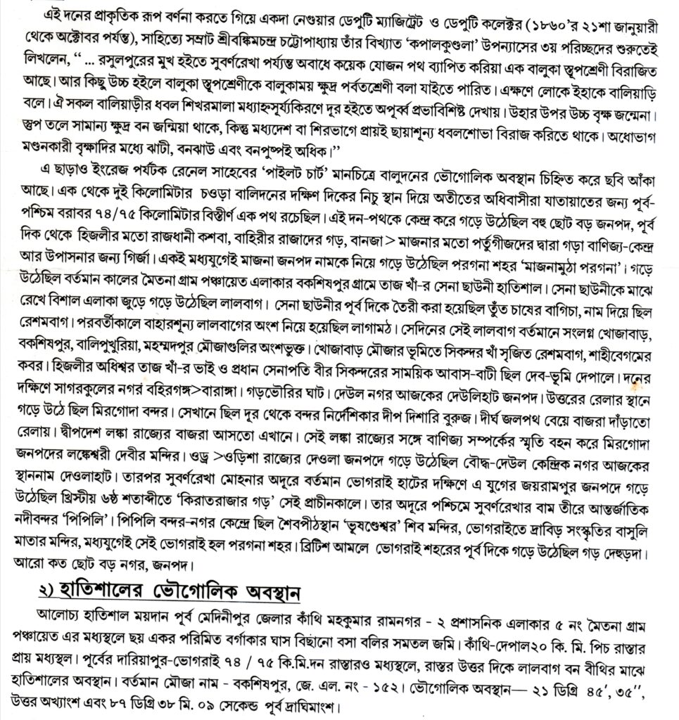 কাঁথির বালিদন হল নিজ-কসবা গ্রাম থেকে কমবেশী ৭৫ কিলোমিটার ধূসরশুভ্র এক বালিচর বা বালিবাঁধ। যেন উপকুলে চীনের প্রাচীর। যেন লাখো লাখো কারিগরের বছরের পর বছর ঘাম ঝরানো বেমিশাল ফসল। আধুনিক ঐতিহাসিকদের মতে, প্রাচীন তাম্রলিপ্তের অবস্থান ছিল, আজকের তমলুক শহরের অবস্থান যেখানে, ঠিক সেই জায়গাতেই। খ্রিস্টীয় তৃতীয় শতকে এক প্রবল জলোচ্ছ্বাসে তাম্রলিপ্তের অদূরেই জেগে উঠেছিল বালির পাহাড় নিয়ে এক বিস্তীর্ণ বালুকাময় ভুভাগ। কাঁথির আজকের এই বালুয়াড়ী সেই খ্রিস্টীয় তৃতীয় শতকের স্বপ্নিল সমুদ্রের খেয়ালী মনের এক অভূতপূর্ব ফসল। ব্রিটিশ প্রশাসক,একদা মেদিনীপুরের কালেক্টর ঐতিহাসিক এইচ.ভি.বেলী তাঁর বিখ্যাত ‘সিলেকশনস্ ফ্রম দ্য রেকর্ডস অফ দ্য বোর্ড অফ রেভিনিউ এ. পি.- রিপোর্ট অন দ্য সেটেলমেন্ট অফ জলামুঠা এস্টেট ‘—এর ৮৯ পৃষ্ঠায় নিম্নোক্ত এই প্রকার ঐতিহাসিক তথ্য দিলেন। ‘The inundation which is mentioned in starling’s Orrissa to have caused the formation of Chilka Lake and to have occurred in the 3rd century of our era is supposed to have reached this part of country and formed this rage and others to the west in the direction of Midnapur’ (তথ্যঃ- রোমন্থন,প্রথম পর্ব,প্রশান্ত প্রামাণিক, পৃ – ১৩)